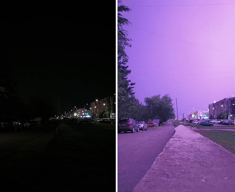 5. Завдяки серійній зйомці встигла спіймати момент, коли блискавка висвітлила вулицю вночі. Ліворуч — те, як вона виглядає у повній темряві.