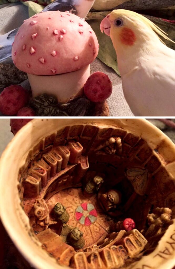 «Коли взяла цей гриб, капелюшок відірвався. Виявилось, що всередині маленька бібліотека! На троні сидить сонечко, поруч повзуть 3 книжкові черв’яки»