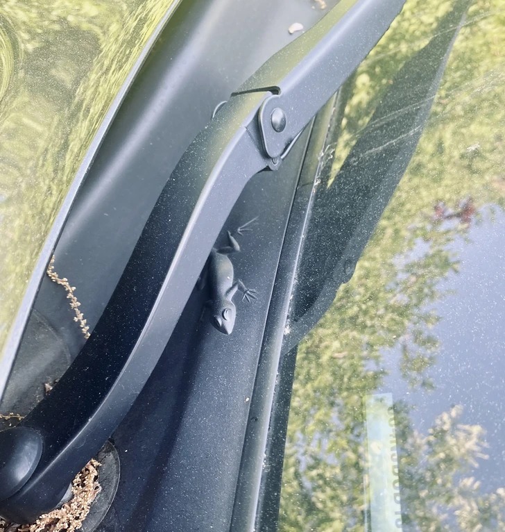 Під склоочисниками на цій машині захована маленька ящірка