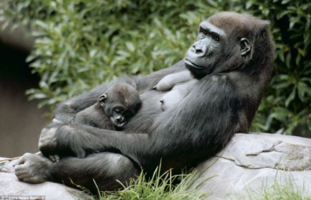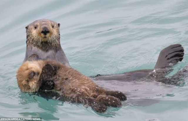Горила хитає свого малюка у колисці в Камеруні, в той час як морська видра несе своє дитинча через бурхливі води Аляски.