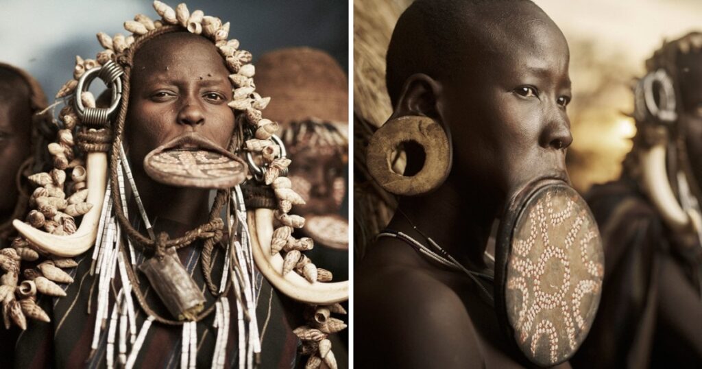 Мурсі – етнічна група Ефіопії недалеко від Південного Судану. Тарілки в губах жінок – аксесуар, сенс якого точно не зрозумілий дослідникам. Але існує три версії: захист від колонізаторів, показник соціального статусу та показник викупу, який віддав за цю жінку чоловік.