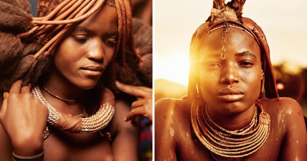 І жінки, і чоловіки племені Хімба покривають свої тіла та волосся сумішшю з охри, жиру, попелу та глини, щоб захиститися від сонця. Але їхні зачіски також є показником статусу. Такі коси дівчатам заплітають лише після дозрівання, а заміжнім належить вплітати в них прикраси, у тому числі зі звірячої шкіри.