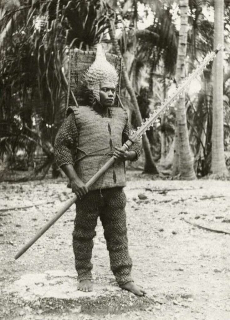 12. Воїн Кірібаті на острові Гілберта в 1900-му році в традиційному вбранні: шолом риби-дикобраза, меч з акулячим зубом і броня з кокосового волокна