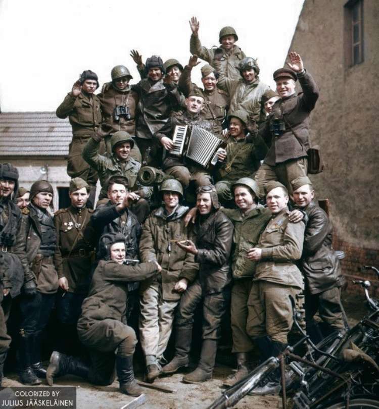 10. Радянські і американські війська в німецькому селі грибів (Саксонія) святкують перемогу у Другій світовій війні. Фото: травень 1945 року