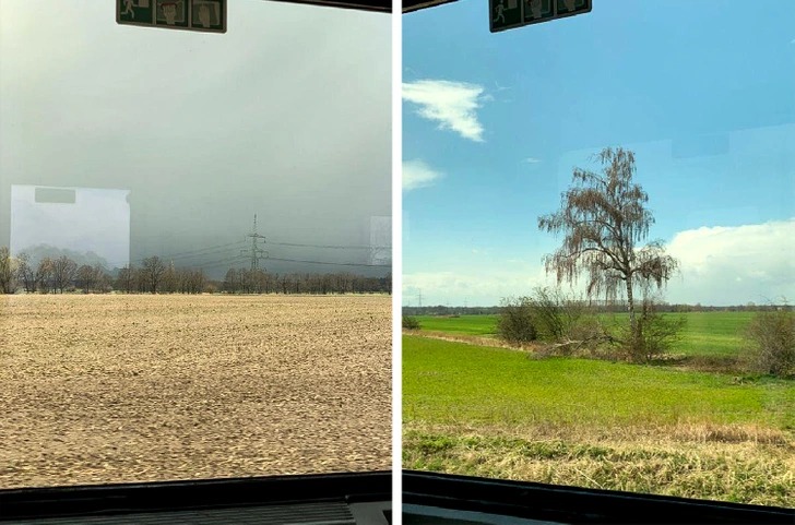 Сіре небо та сонячний день. Фотографії зроблені в один і той же час з поїзда, просто з лівого та правого боку
