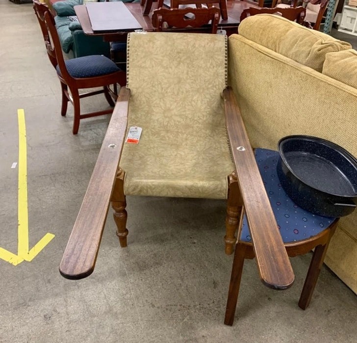 Відповідь: Це стілець плантатора з похилою спинкою і подовженими підлокітниками для ніг. Просидівши весь день верхи на коні, плантатори, приходячи додому, сідали на стілець, закидаючи ноги на підлокітники. Таким чином вони могли розслабитися і дати ногам відпочити.