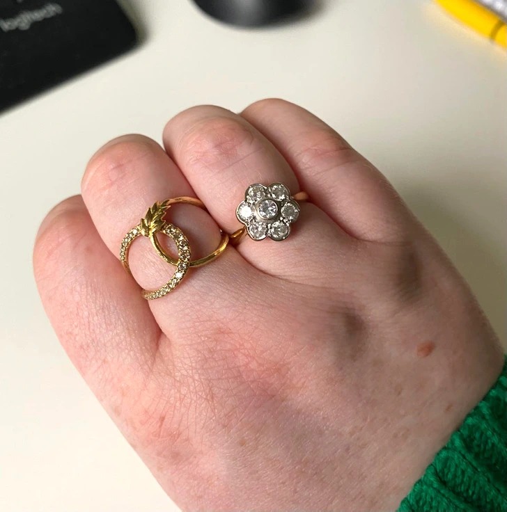 «На середньому пальці – з коричневими діамантами, на безіменному – з діамантовою ромашкою, її я знайшла в секонд-хенді».