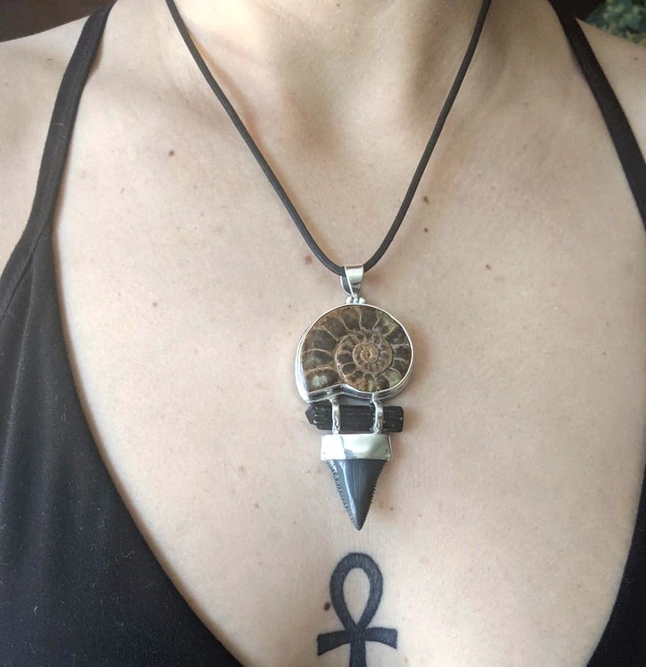«Один з моїх улюблених кулонів. Амоніт, турмалін і зуб акули»