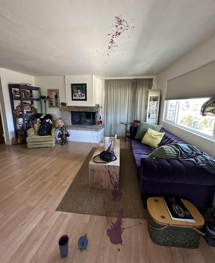 «Підліток, який працює в магазині фарб, мабуть, не закрив банку як слід, і злегка зеленувато-сіра фарба для стін тепер красується на підлозі моєї нової машини. Хлопець із магазину відповів мені довгими вибаченнями і дав мені ще одну банку фарби. Прекрасно».