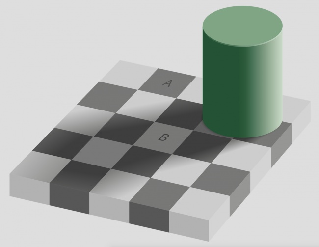 Подивіться уважно на шахівницю. Якого кольору квадрати “А” і “B”? “А” здається чорним, а “В” – білим, чи не так? Але прогорніть трошки вниз.