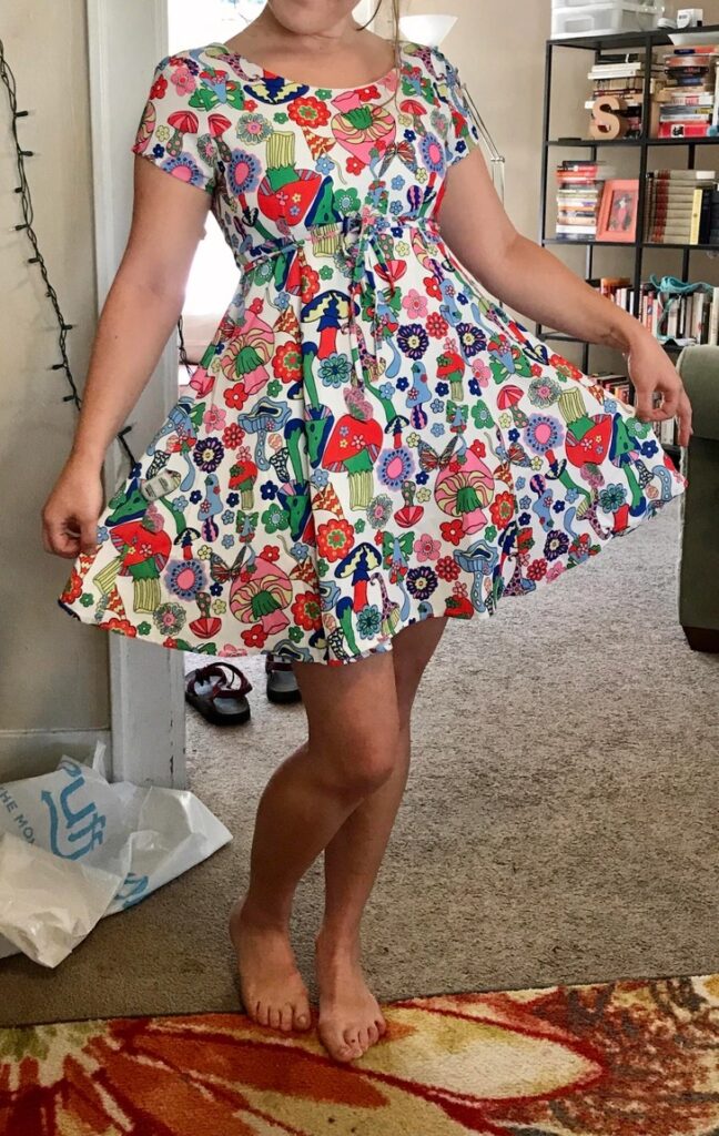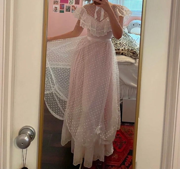 «Ця вінтажна сукня, куплена на гаражному розпродажі за $15, сидить на мені як влита. Я відчуваю себе героїнею роману «Гордість і упередження»»